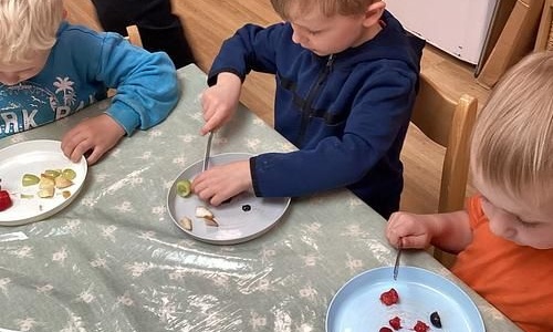 Children in nursery enjoyed making their own healthy snack. They identified the different equipment they would need and used knives to chop their fruit. Some children even helped with the washing up!